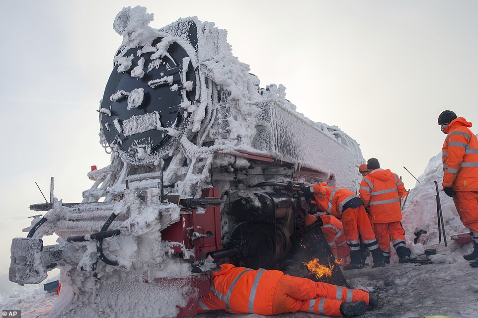 Các công nhân đang loại bỏ lớp tuyết bám vào đầu máy xe lửa ở khu vực gần Wernigerode, miền đông nước Đức.