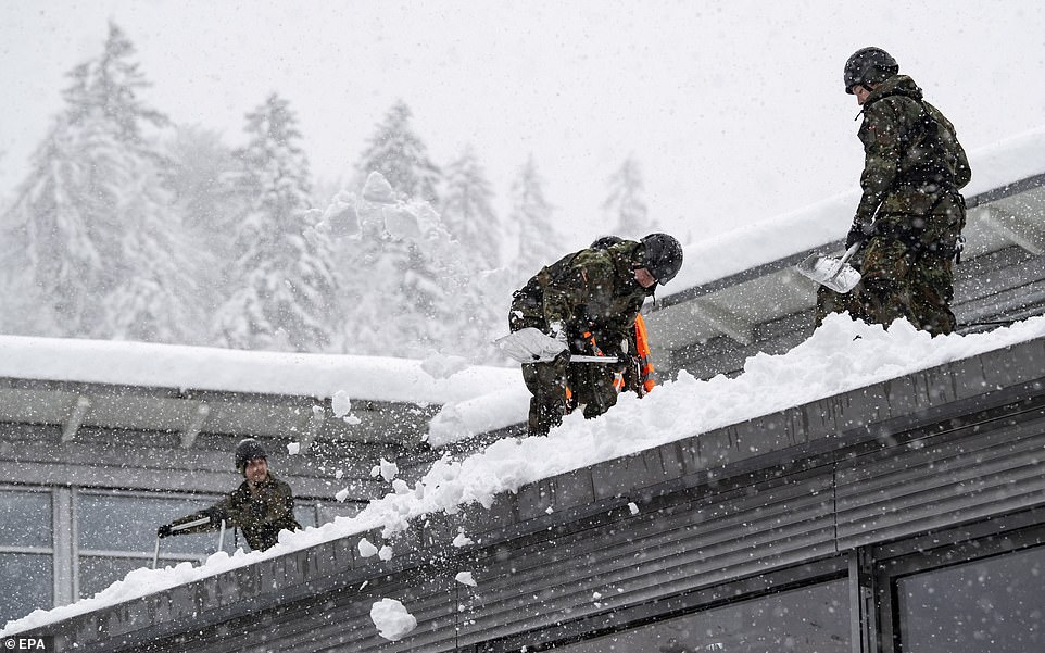 Binh sĩ Đức dọn tuyết phủ kín trên mái một trường học ở Berchtesgaden, bang Bavaria.