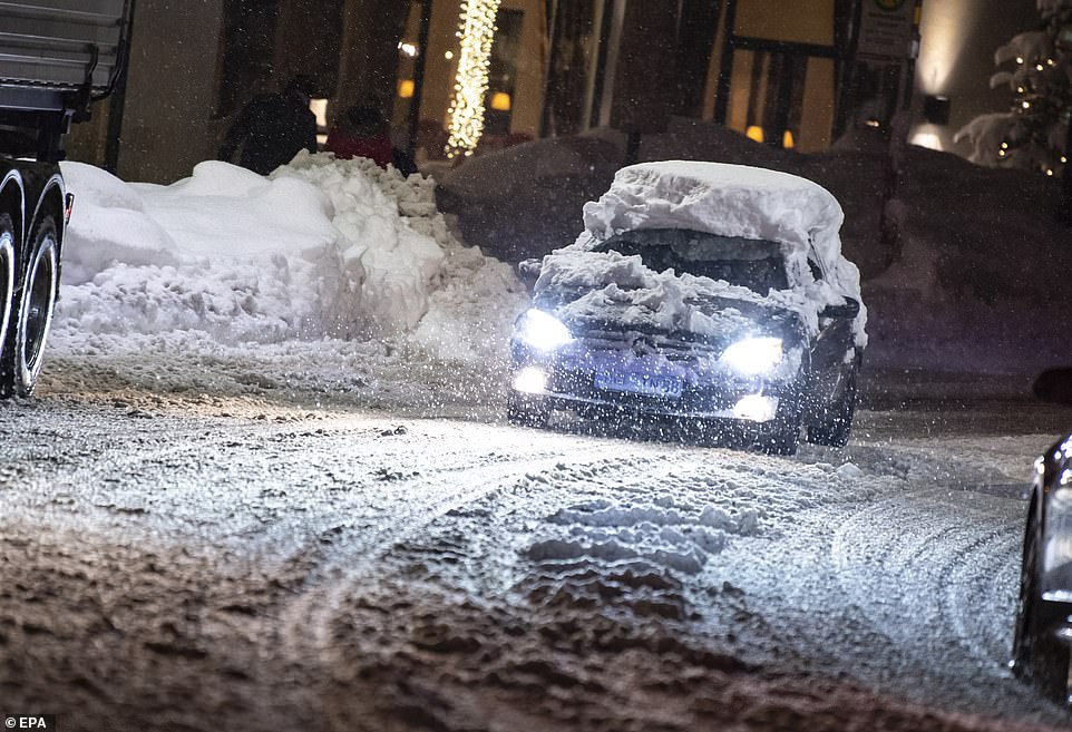 Tuyết phủ kín nóc xe hơi dọc một con đường đầy tuyết ở thị trấn Berchtesgaden, Bavaria, Đức ngày 10/1. Áo, miền nam nước Đức đang hứng chịu những trận tuyết rơi dày đặc.