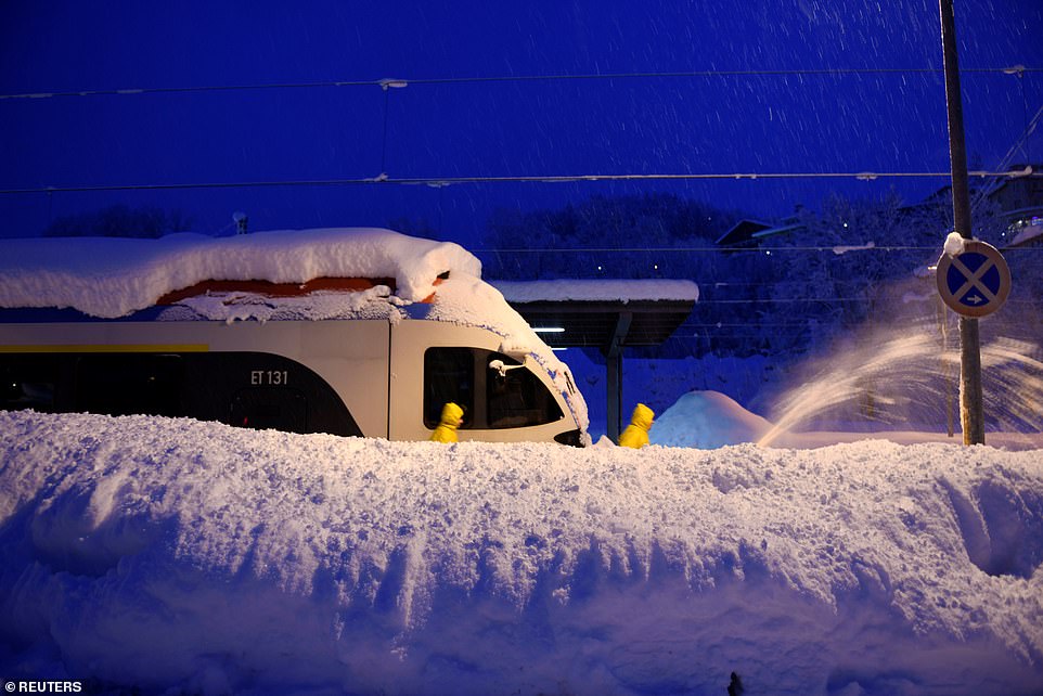 Tàu điện ngầm phủ tuyết trắng mắc kẹt tại ga Berchtesgaden, một thị trấn miền nam nước Đức. Hàng trăm người được cho là mắc kẹt ở thị trấn này những ngày qua.