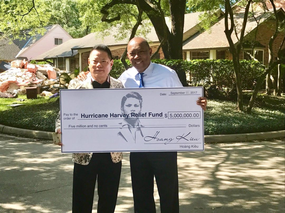 Trong một buổi họp báo được tổ chức vào thứ hai vừa qua tại Houston, Mỹ, ông Hoàng Kiều đã công bố về phần quyên góp cùng thị trưởng Houston, Sylvester Turner.