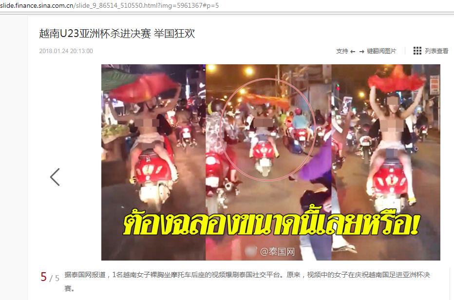 Các trang báo Trung Quốc cũng đưa tin về hình ảnh “kém đẹp” này. Trang Sina của Trung Quốc viết: “Theo trang tin Thái Lan, một người phụ nữ Việt Nam đã cởi áo ngồi trên xe máy đi khắp phố. Hóa ra người phụ nữ đó đang ăn mừng chiến thắng khi đội tuyển Việt Nam bước vào trận chung kết U23 Châu Á”.