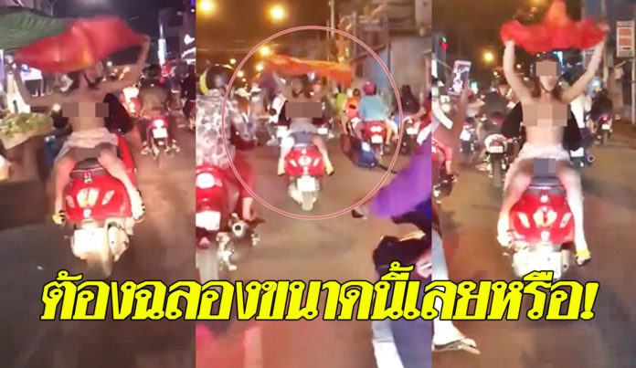 Cô gái trẻ chỉ mặc một chiếc váy ngắn và để lộ phần trên, ngồi quay ngược lại trên xe máy, hò reo khắp phố. Nhiều cổ động viên xung quanh đã lấy điện thoại quay video và chụp ảnh về cách ăn mừng “có một không hai” của cô gái và đăng lên các trang mạng xã hội. Đoạn clip thu hút rất nhiều lượt xem và bình luận, trong đó đa phần là ý kiến bất bình.