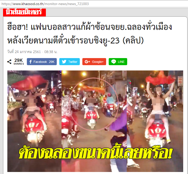 Một số hình ảnh được cho là cổ động viên Việt Nam cởi bỏ quần áo khi đi trên đường phố đang được chia sẻ trên truyền thông Thái Lan và Trung Quốc. Trang Khaosod của Thái Lan đăng bài viết về nữ cổ động viên lột đồ khoe thân ăn mừng chiến thắng của U23 Việt Nam trong trận bán kết vừa qua. Bài viết có tiêu đề: “U23 Việt Nam chiến thắng! Cô gái khoả thân diễu hành khắp phố”.