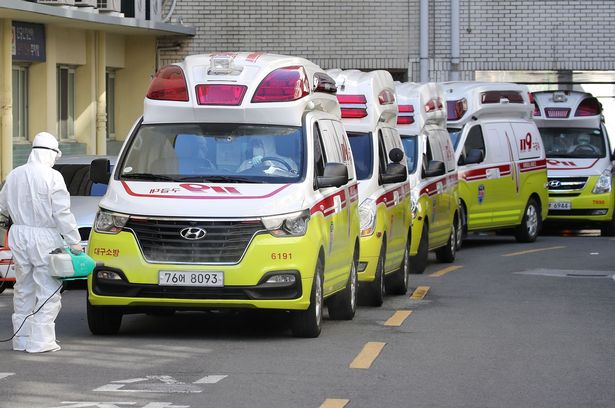 Xe cấp cứu chở bệnh nhân nhiễm Covid-19 đến bệnh viện ở Daegu.