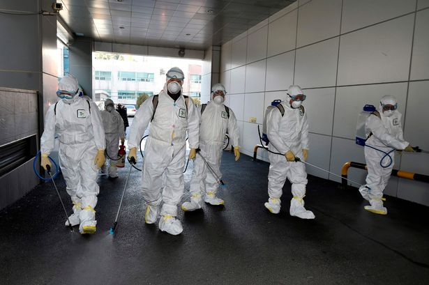Nhân viên y tế khử trùng tại chi hội của Tân Thiên Địa ở Daegu.