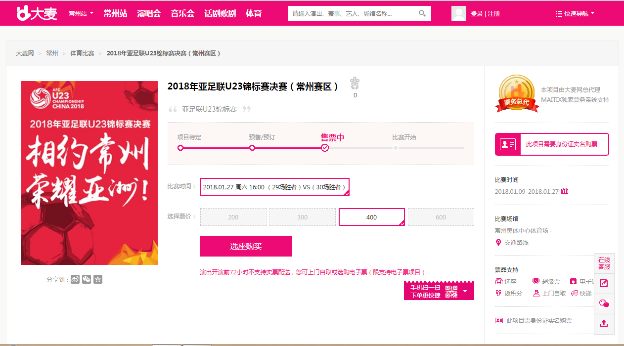 Trang web bán vé chính thức giải U23 Châu Á hiện chỉ còn loại 400 tệ.