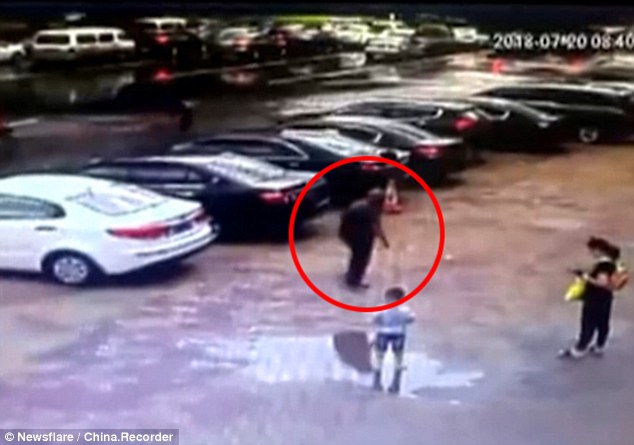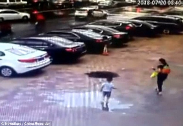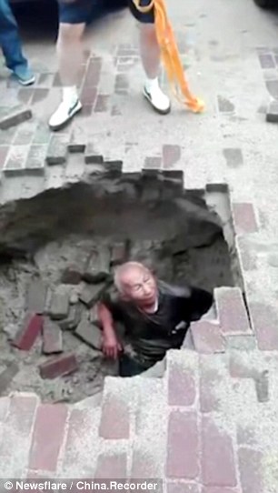 Ông cụ đang đi vào một bãi đậu xe ở thành phố Giai Mộc Tư trước khi con đường đột ngột sụp xuống.