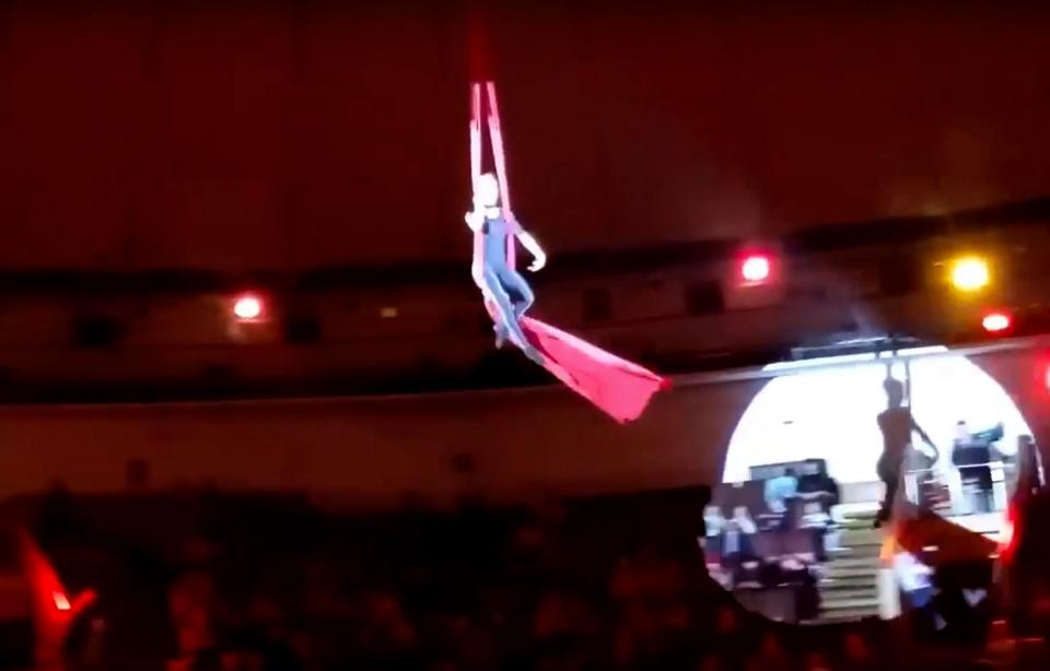 Diễn viên xiếc người Nga bị tuột tay khi đu dây lụa. Ảnh: The Sun