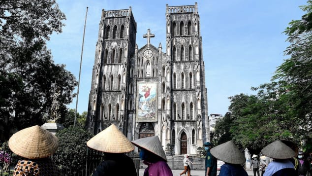 Người dân xếp hàng chờ lấy gạo miễn phí tại Nhà thờ St. Joseph ở khu phố cổ Hà Nội, ngày 27/4.