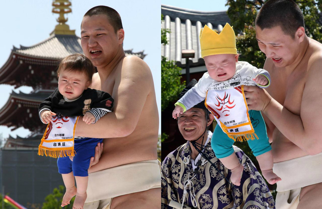 Mỗi võ sĩ sumo sẽ giữ một đứa bé trên tay với nhiệm vụ duy nhất là làm cho đứa trẻ khóc thật to.