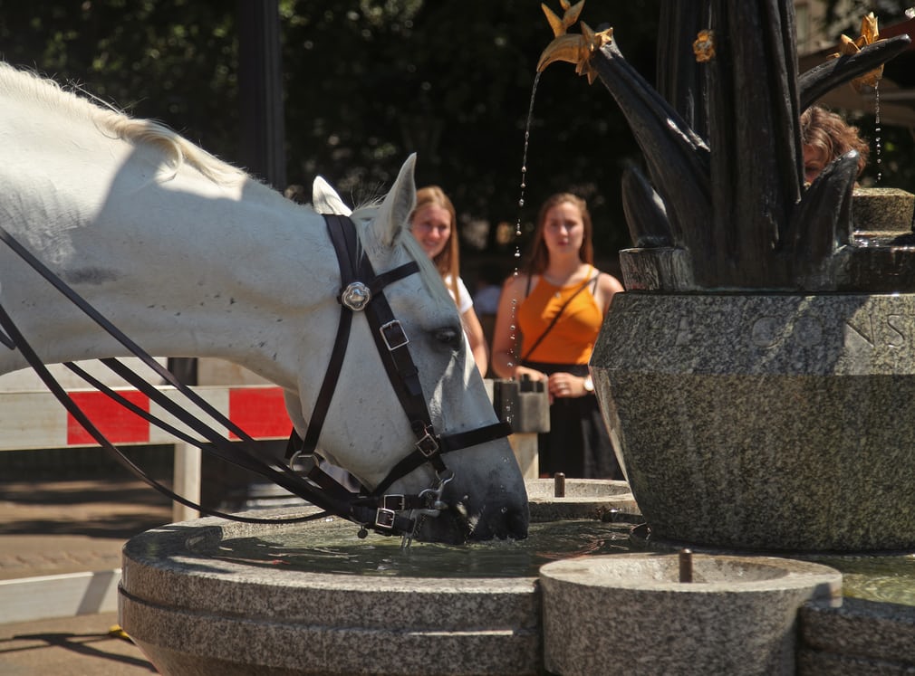 Những chú ngựa đi tuần của cảnh sát cũng phải dừng chân để uống nước tại công viên Green Park, London. Ảnh: Yui Mok