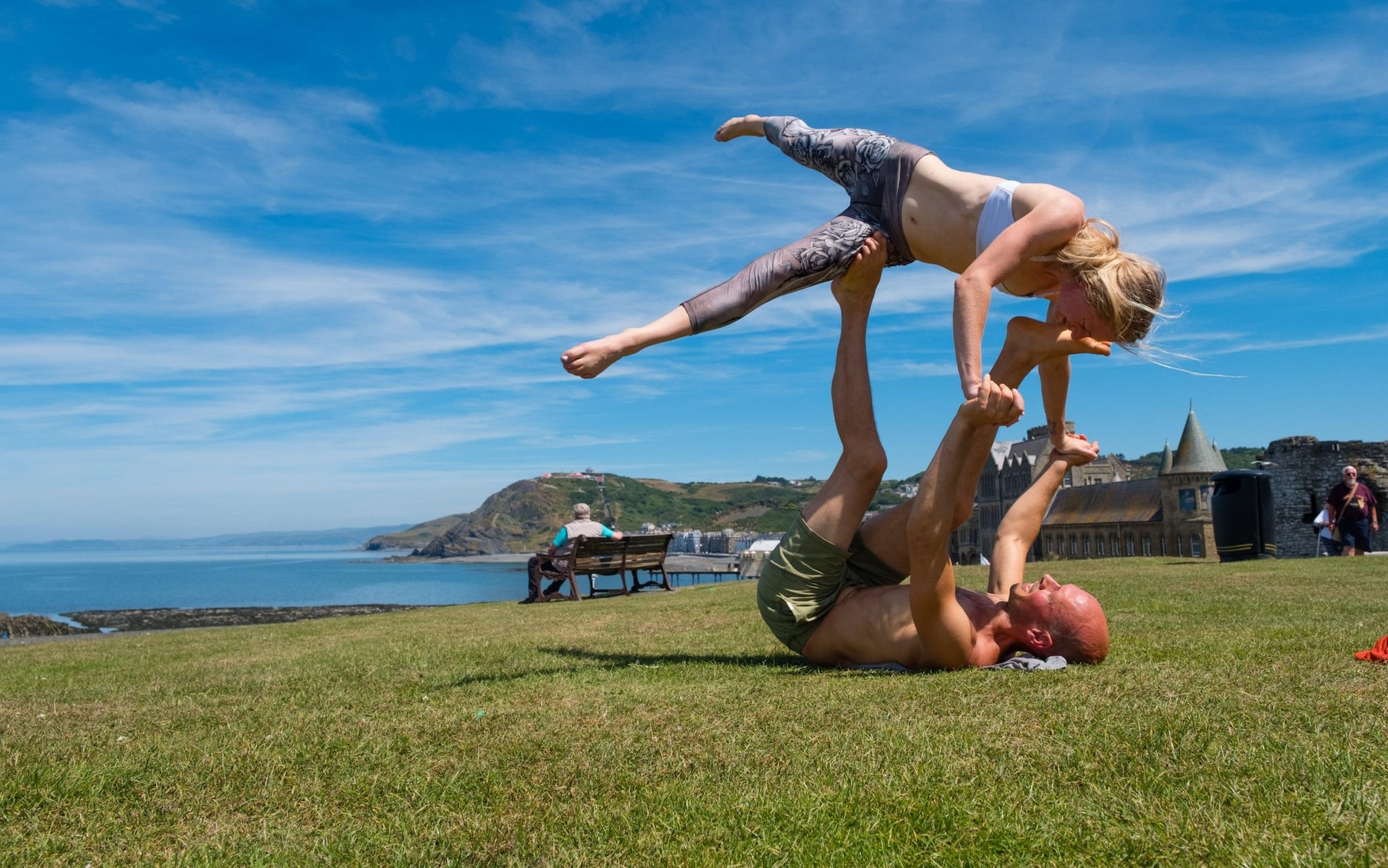 Cặp đôi luyện tập yoga trên ngọn đồi gần lâu đài Aberystwyth. Ảnh: Keith Morris