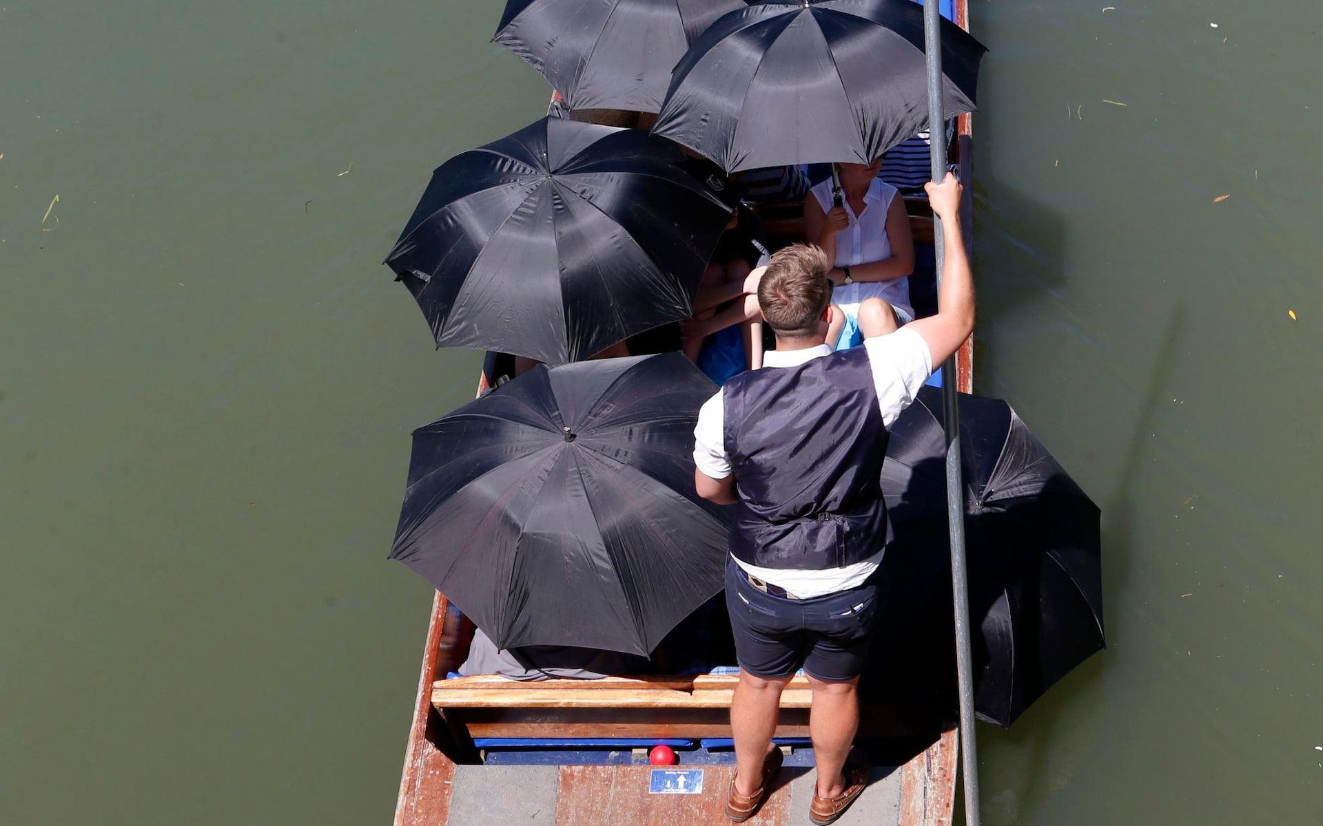 Du khách phải dùng đến những chiếc ô để che nắng khi đi thuyền dọc theo dòng sông Cam ở Cambridge. Ảnh: Splash News