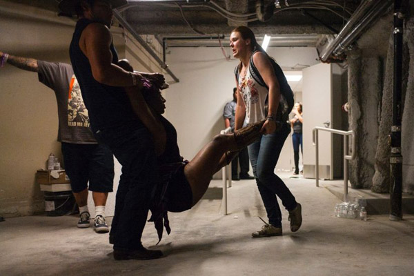 Mọi người đang cố gắng di chuyển một người phụ nữ bị thương nặng.