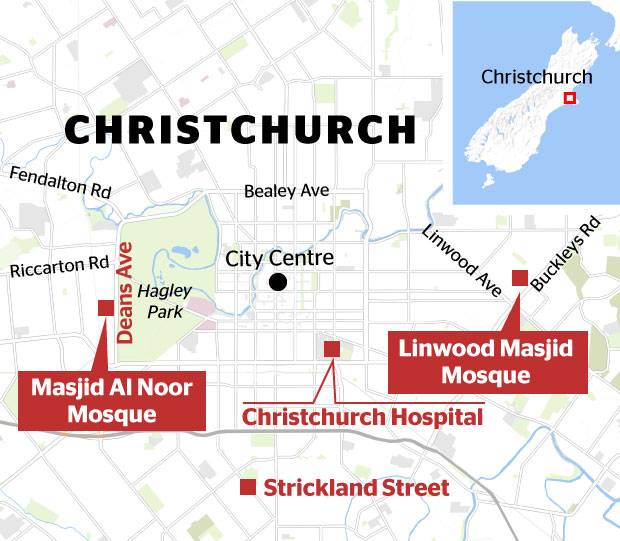 Hai vụ xả súng xảy ra ở hai nhà thờ riêng rẽ của thành phố Christchurch. Đồ họa: NZH