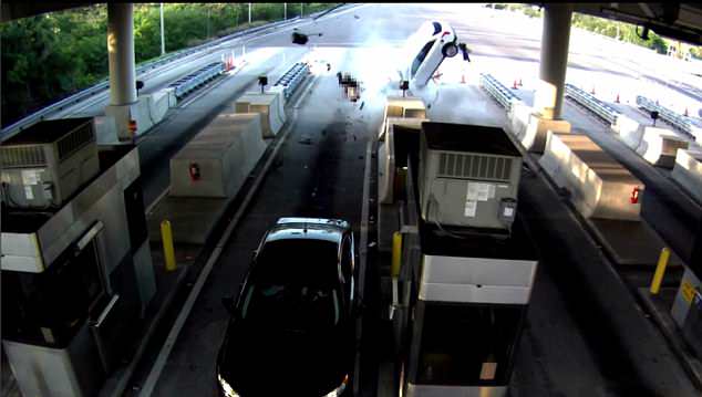 Chiếc xe đâm mạnh vào trạm thu phí với vận tốc cực nhanh.