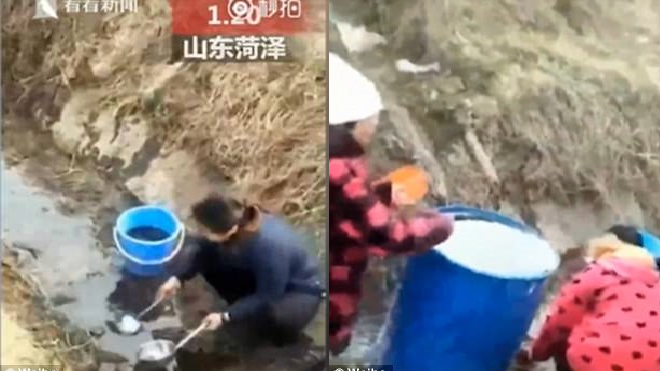 Đoạn video do Pearl Video đăng tải gần đây cho thấy, khoảng chục người dân “hớt hải” đi lấy dầu từ một con mương bẩn, sau khi nghe tin xe tải chở dầu bị lật. Họ xếp hàng dọc theo con mương, “tay xô, tay xẻng” cố gắng múc càng nhiều dầu càng tốt. Sự việc được ghi nhận ngày 20/1 tại tỉnh Sơn Đông, Trung Quốc.