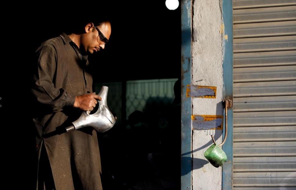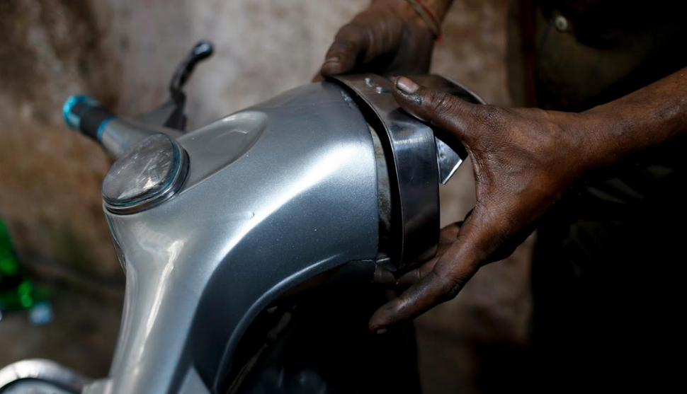Một công nhân đang cố gắng khôi phục bộ phận của xe Vespa ở Islamabad.