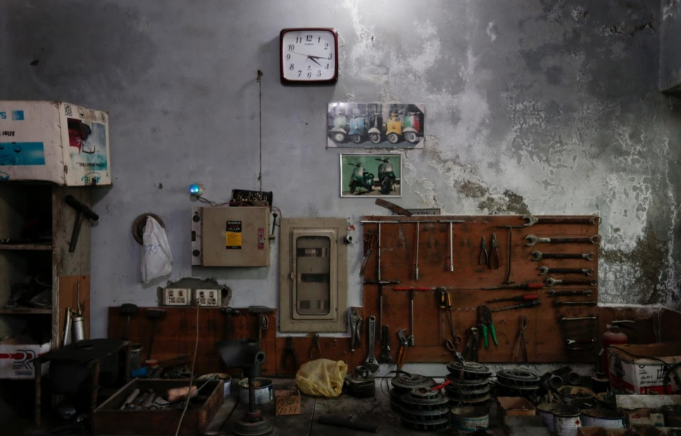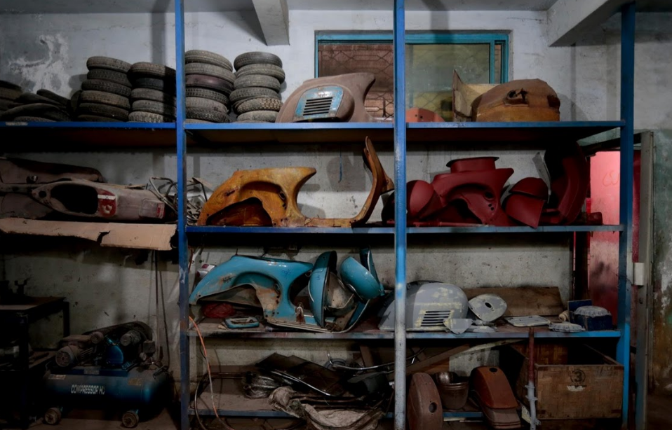 Các bộ phận và dụng cụ để sửa chữa cho Vespa cổ tại một xưởng sửa chữa xe máy.