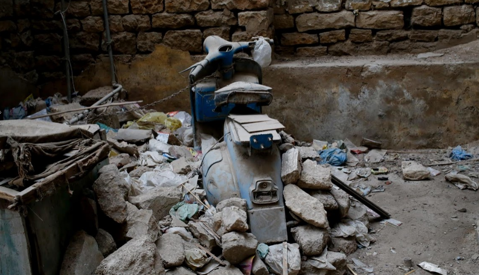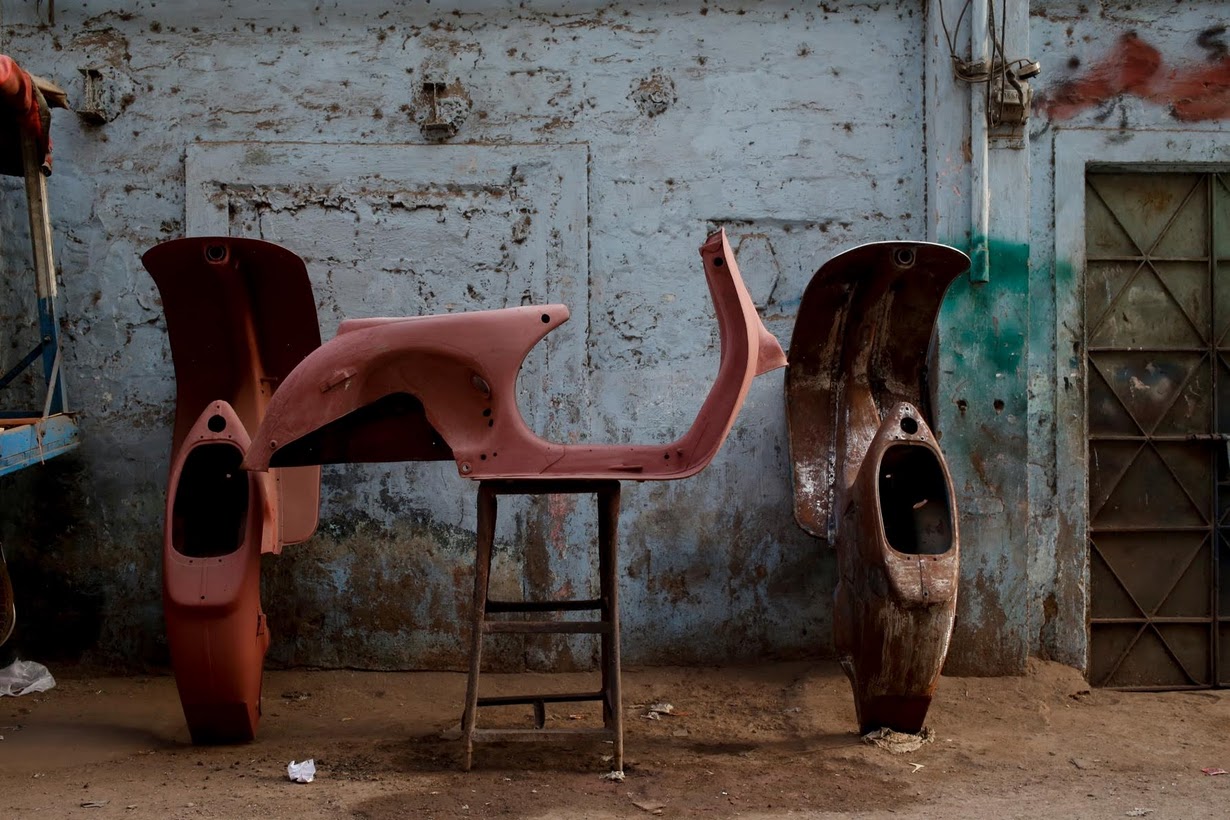 Các bộ phận của xe Vespa bên ngoài một xưởng sửa chữa xe ở thành phố Karachi.