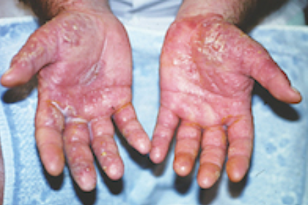Đôi bàn tay ửng đỏ sưng tấy của bác sĩ.