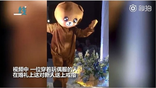 Mới đây, một đoạn video ngắn quay cảnh hôn lễ của một cặp đôi Trung Quốc đang được lan truyền rộng rãi trên Weibo. Khi đám cưới đang diễn ra, một người mặc trang phục gấu nâu bất ngờ xuất hiện tại hôn trường. Chú gấu nâu này nhảy múa từ ngoài cửa rồi dần dần tiến lại gần cô dâu chú rể.