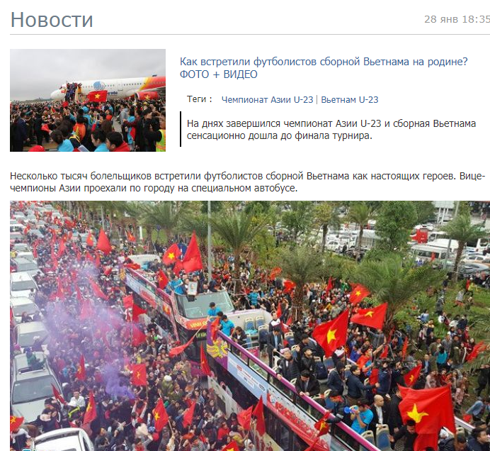 “Hàng vạn người hâm mộ đã chào đón các cầu thủ của đội tuyển Việt Nam như những anh hùng thực sự. Á quân của giải U23 châu Á đã đi khắp thành phố trên chiếc xe buýt đặc biệt', trang tin này cho biết.