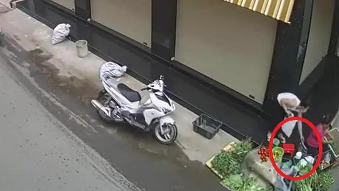 Cụ thể, clip ghi lại cho thấy, một người phụ nữ ăn mặc lịch sự, ngoại hình cao ráo, đi xe ga đắt tiền, sau khi quan sát thấy “con mồi”, cô gái này liền tấp xe máy vào lề đường, bình tĩnh tiến đến gần chỗ bà cụ bán rau.