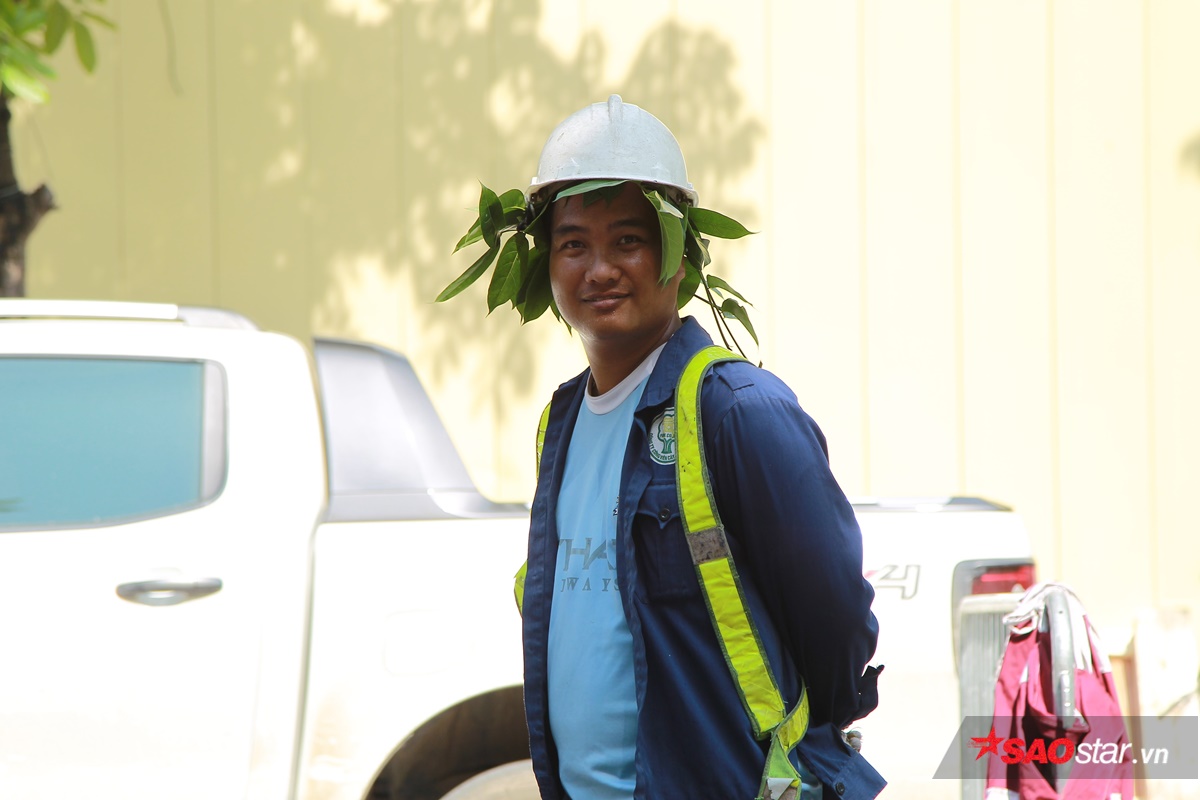 Anh công nhân đội lá lên đầu để chống nắng.