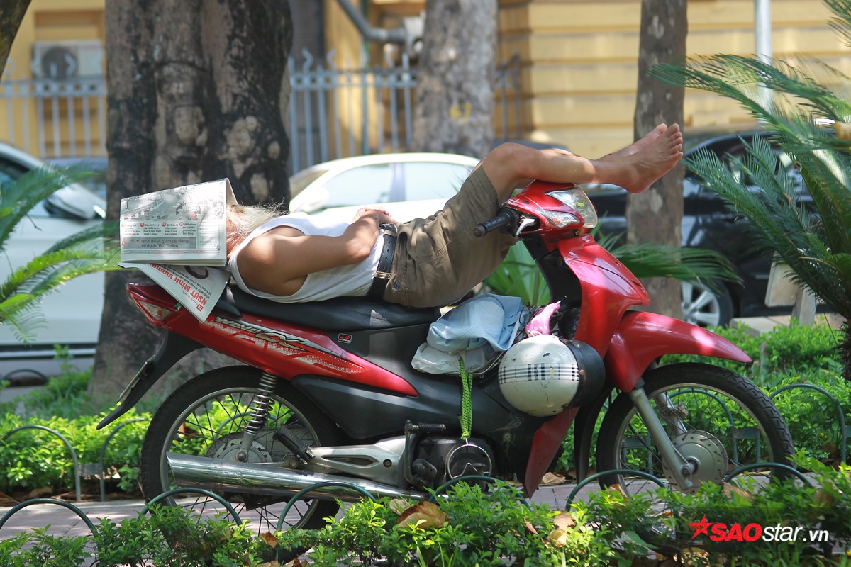 Bác xe ôm nằm ngủ ngay trên phương tiện chuyên dùng để kiếm cơm. Vật chống nắng duy nhất là một tờ báo úp lên mặt.