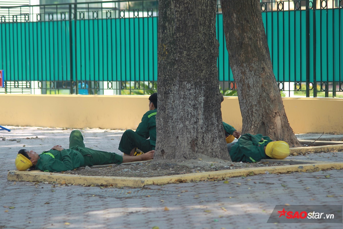 Nhóm công nhân ngủ vạ vật dưới bóng cây cổ thụ.