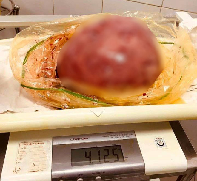 Ca mổ kéo dài gần 2 giờ đồng hồ, trong quá trình mổ, bác sĩ phát hiện 2 phần phụ của bệnh nhân teo nhỏ, khối u to tương đương thai 9 tháng tuổi. Khối u bóc ra nặng 4,125 kg.
