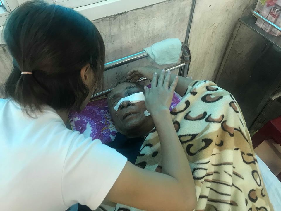 Nằm trên giường bệnh tại khoa ngoại thần kinh, Bệnh viện đa khoa tỉnh Nam Định, đôi mắt ông Được sưng húp, trên đầu được băng bó vì nhiều thương tích.