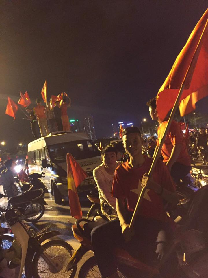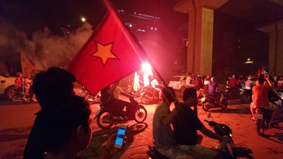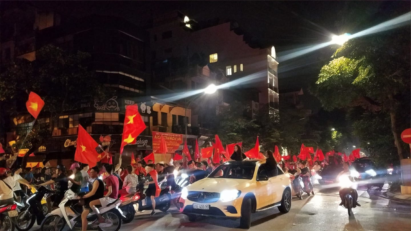 Ngay khi ĐT Việt Nam đánh bại Malaysia, các CĐV đã đổ ra đường ăn mừng. Ảnh: Tiến Thành Vũ.