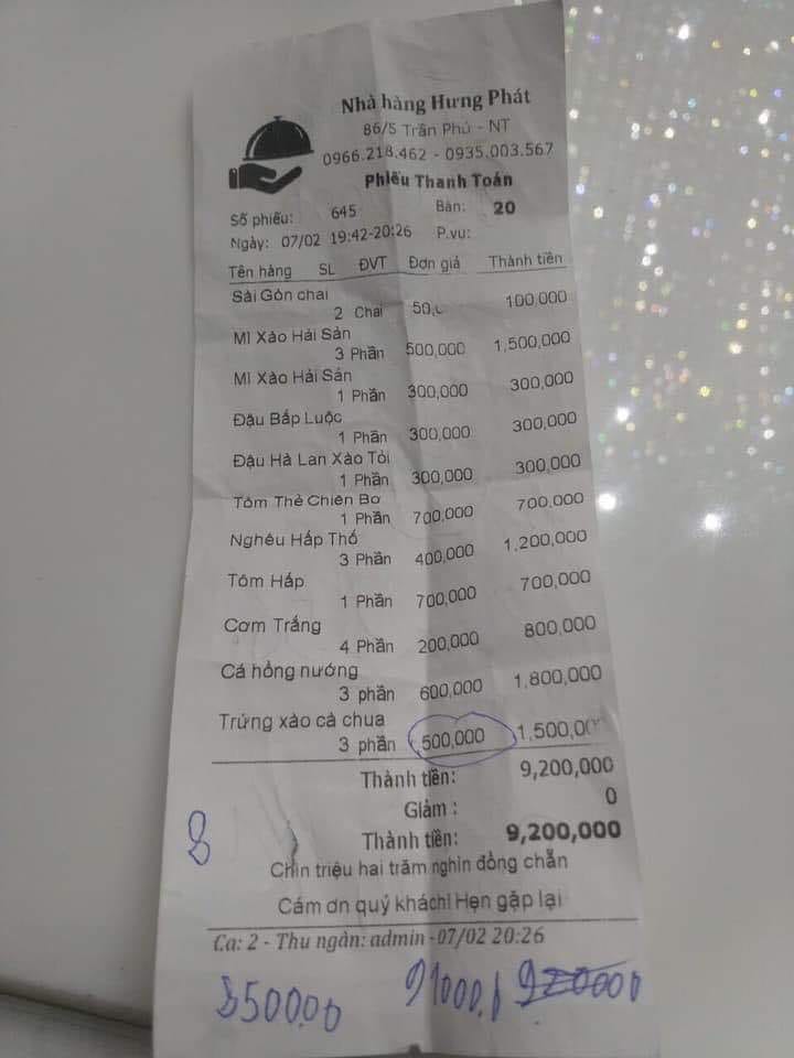 Ông Phụng sau khi nhận được thông tin đã gọi điện cho chủ mới và người quản lí nhà hàng để hỏi rõ. Theo người quản lí, tối mùng 3 Tết, nhân viên bấm đại để ra hoá đơn, thực chất chỉ thu hơn 5 triệu đồng theo phần ăn của khách chứ không phải con số 9,2 triệu đồng như trên hoá đơn.