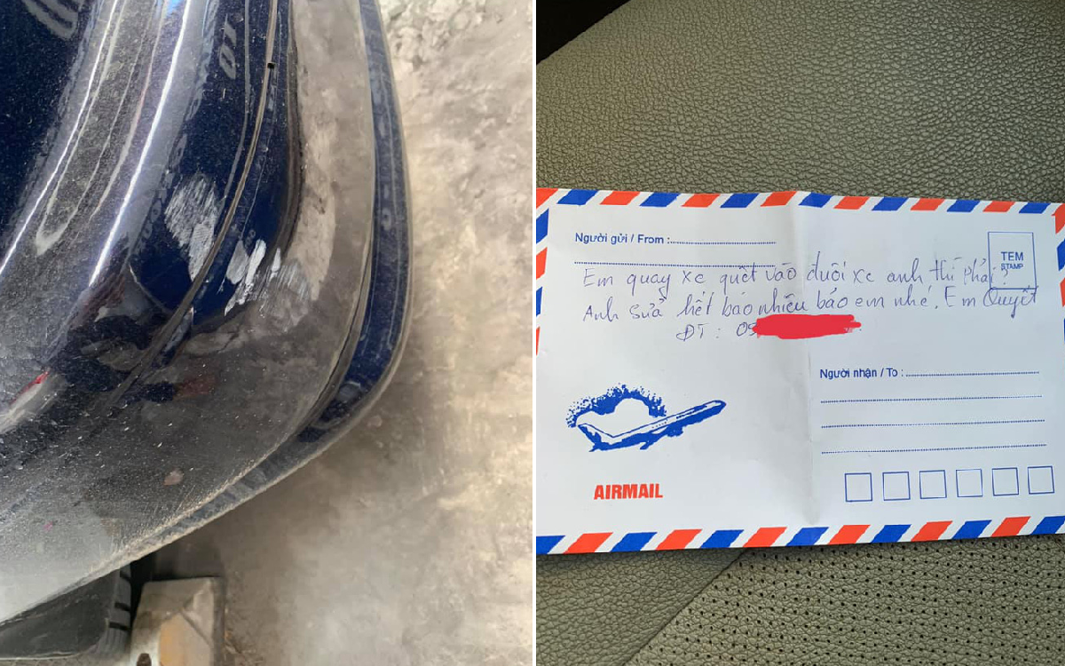 Theo đó anh chàng này để lại lời nhắn trên chiếc phong bì rỗng: “Em quay xe quệt vào đuôi xe anh thì (phải làm sao)? Anh sửa hết bao nhiêu bảo em nhé! Em Quyết”. Kèm theo đó là số điện thoại để tài xế ô tô liên hệ khi cần.