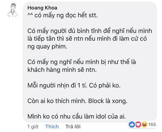 “Mặc dù yêu quý anh nhưng em không đồng tình với quan điểm này… Anh đừng ác cảm với việc nhiều nguời hùa nhau report. Có những việc làm theo “bầy đàn” là sai, nhưng có những việc cần xã hội mới trị được. Bởi vì người gặp phải trường hợp là Khoa Pug, anh ấy có tầm ảnh hưởng nên nhiều người mới biết chứ nếu như gặp người khác thì chắc chuyện này được giấu đi rồi…”, tài khoản D.A.L chia sẻ.