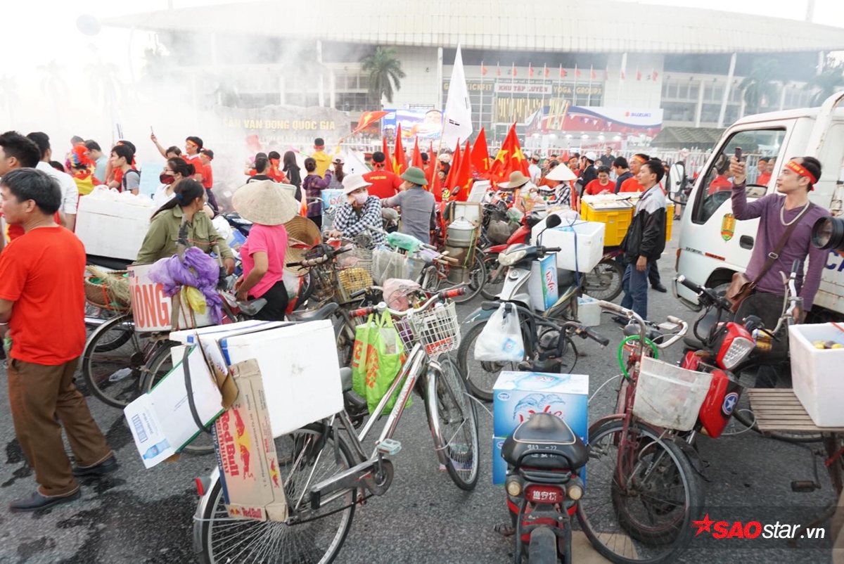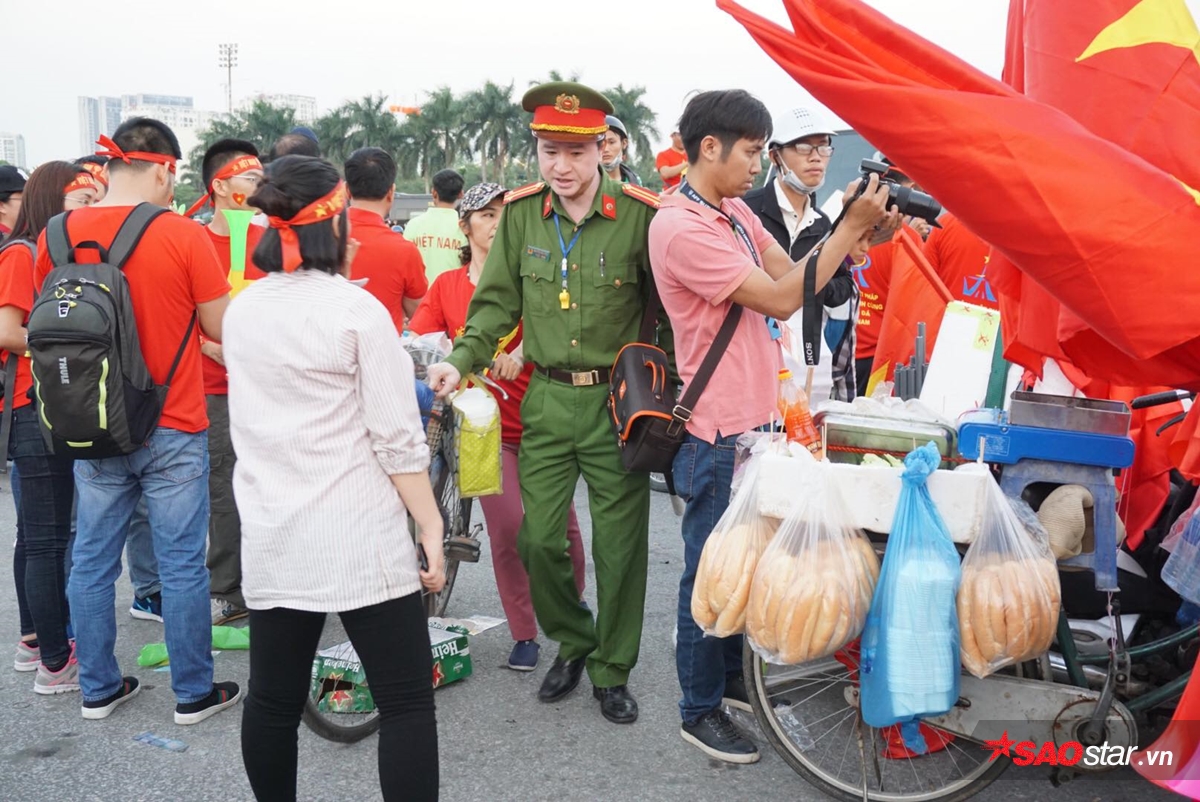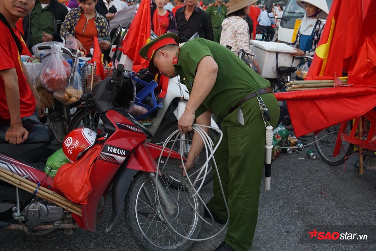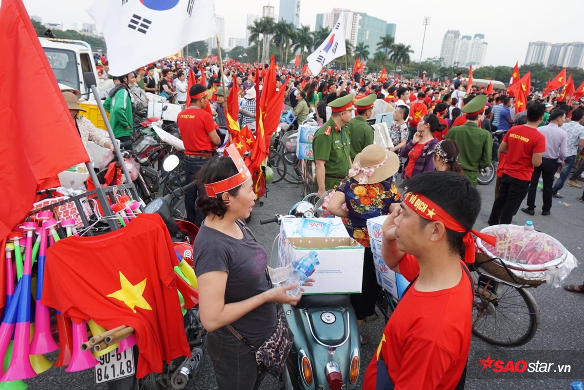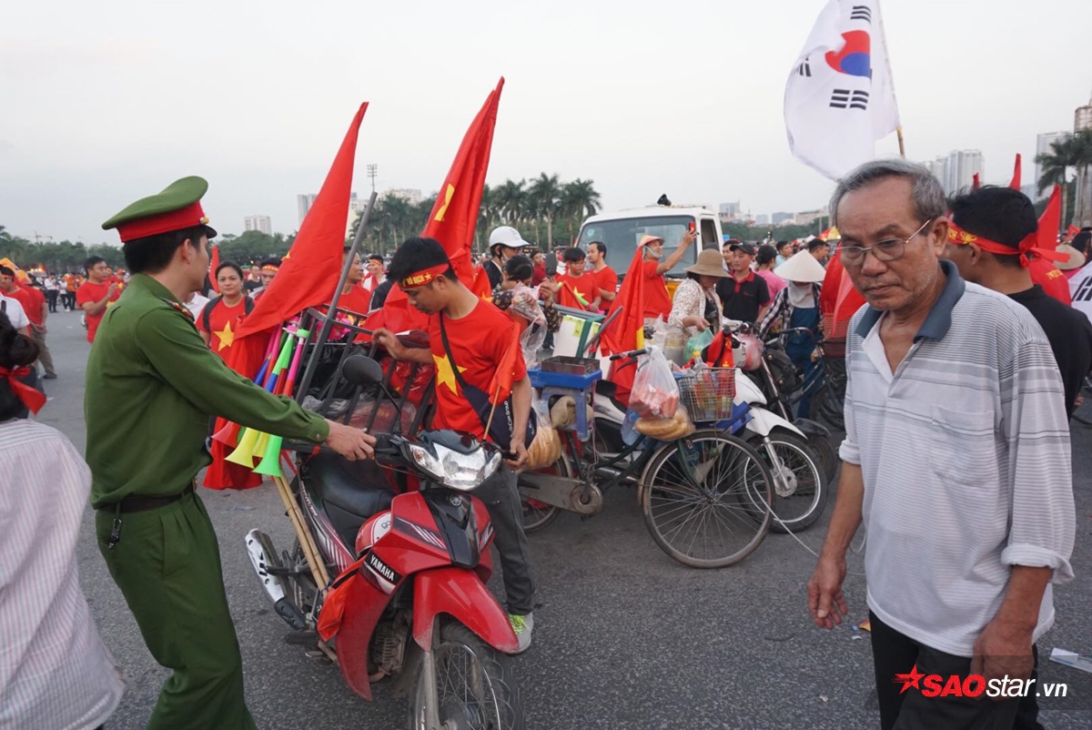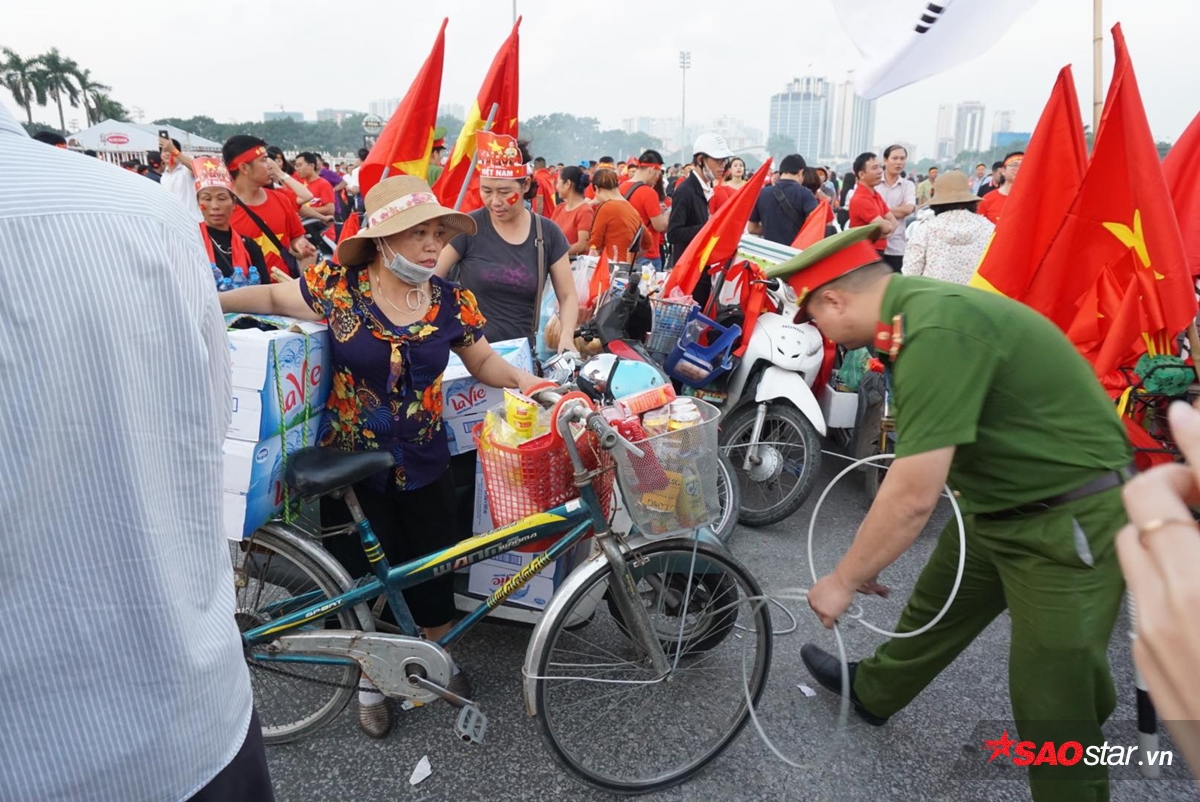 Lúc này, hàng vạn cổ động viên tập trung rất đông trước sân vận động Mỹ Đình. Để khắc phục tình trạng nhiều người bán hàng rong lấn chiếm lòng đường, lực lượng chức năng đã tiến hành dẹp gọn và khóa các xe này lại.