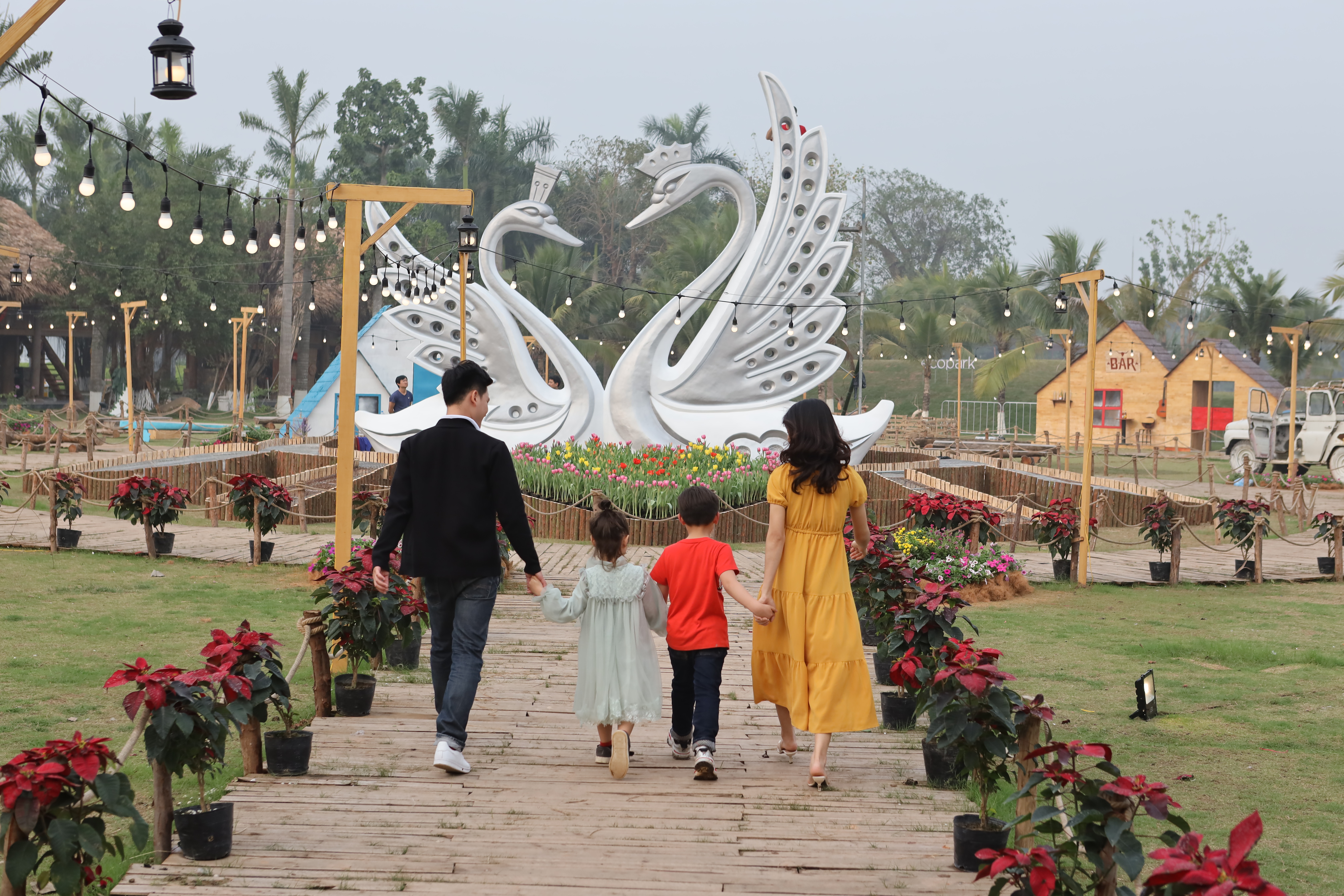 Ngay từ khi bước vào, du khách được đón bằng con đường hoa với muôn màu. Thời điểm này những loài hoa cúc, hoa hồng, hoa cúc hồ điệp… tại Công viên hồ thiên nga (Ecopark) đang bung nở rực rỡ tạo nên cảnh sắc thiên nhiên thơ mộng.