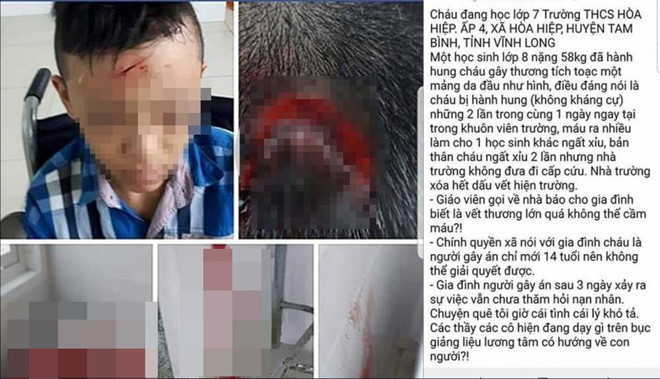 “Cháu ngất xỉu 2 lần nhưng nhà trường không đưa đi cấp cứu. Nhà trường xóa hết dấu vết hiện trường. Giáo viên gọi về nhà báo cho gia đình biết là vết thương lớn quá không thể cầm máu”, thông tin được đăng trên mạng.