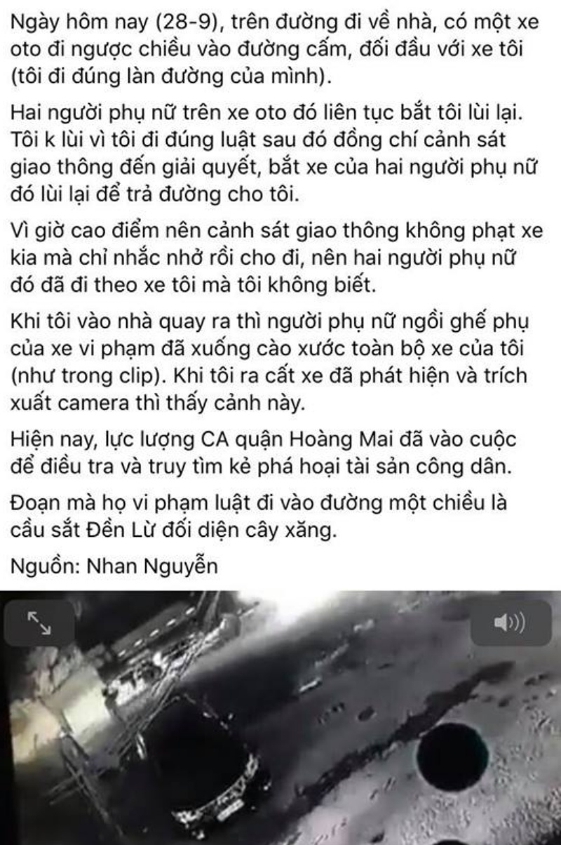 Vì giờ cao điểm nên cảnh sát giao thông không phạt xe kia mà chỉ nhắc nhở rồi cho đi, nên hai người phụ nữ đó đã đi theo xe tôi mà tôi không biết. Khi tôi vào nhà quay ra thì người phụ nữ ngồi ghế phụ của xe vi phạm đã xuống cào xước toàn bộ xe của tôi (như trong clip). Khi tôi ra cất xe đã phát hiện và trích xuất camera thì thấy cảnh này.