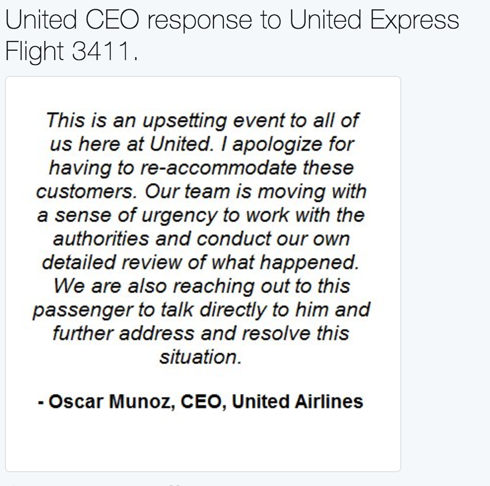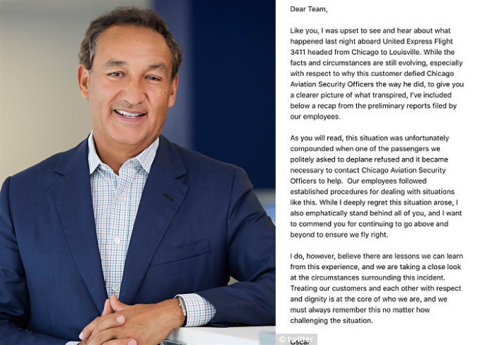 Sau khi sự việc xảy ra, ông Oscar Munoz đã nhanh chóng gửi lời xin lỗi đến những hành khách đã phải chịu đựng cảnh không hay đó, đồng thời cũng cho biết sẽ gặp gỡ trực tiếp người bị nạn để giải quyết tình huống này.