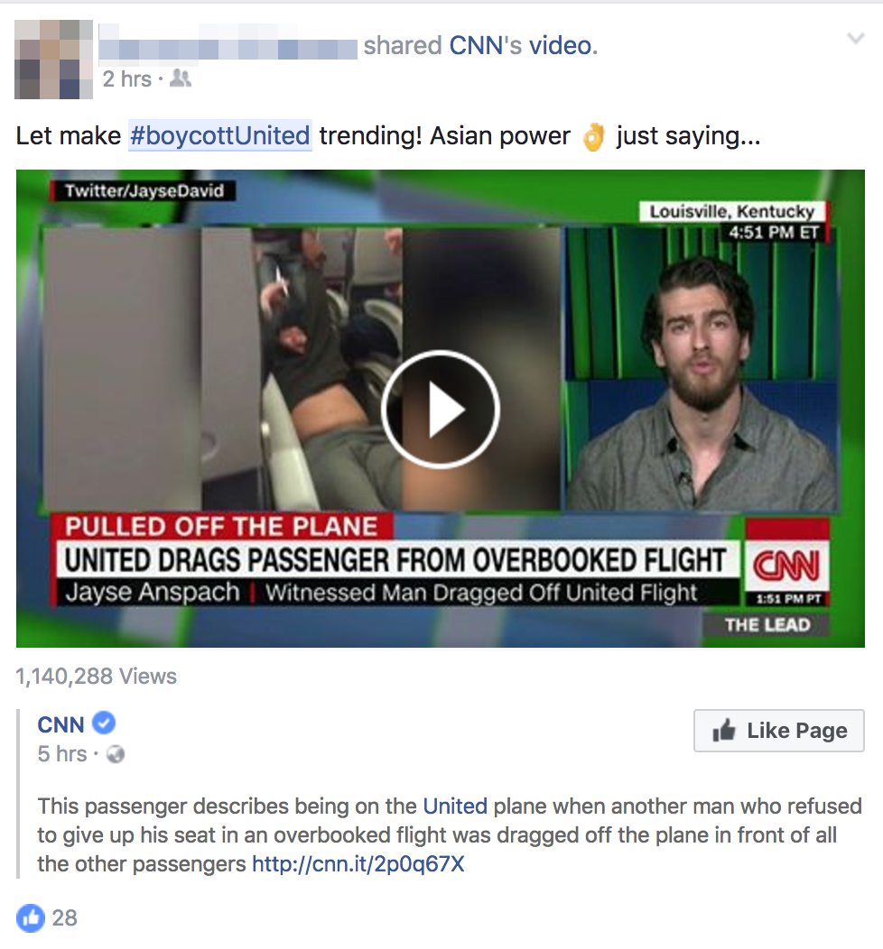 Ngay sau khi thông tin về hành khách người châu Á bị buộc phải rời khỏi chuyến bay 3411 của United Airlines xuất phát từ phi trường O'Hare, Chicago đến Louisville, Kentucky, Mỹ bằng biện pháp bạo lực được lan truyền rộng rãi trên mạng xã hội, sự kiện này đã trở thành điểm nóng trong ngày đầu tuần vừa qua. Hashtag #boycottunited (tẩy chay United) hiện đang được sử dụng khắp các mạng xã hội lớn như Facebook, Twitter để chống lại hành động “đáng xấu hổ” của hãng hàng không này.