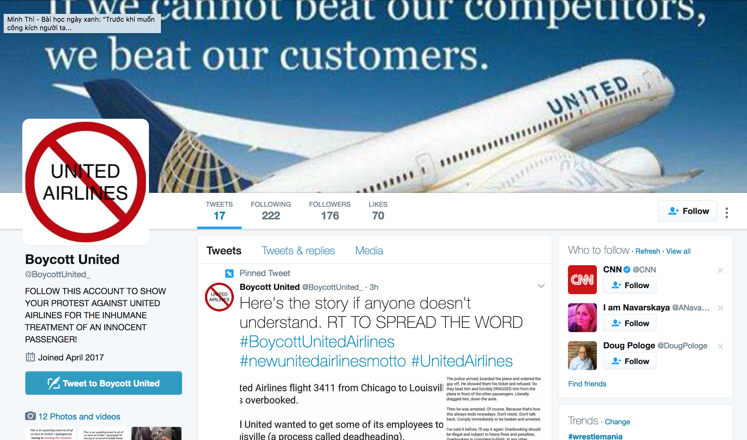 Trang Twitter phản đối United Airlines nhanh chóng được thành lập.