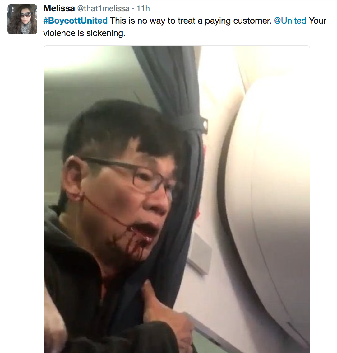 Tài khoản Mellisa cho rằng hành động bạo lực của United Airlines là cực kì kinh khủng.