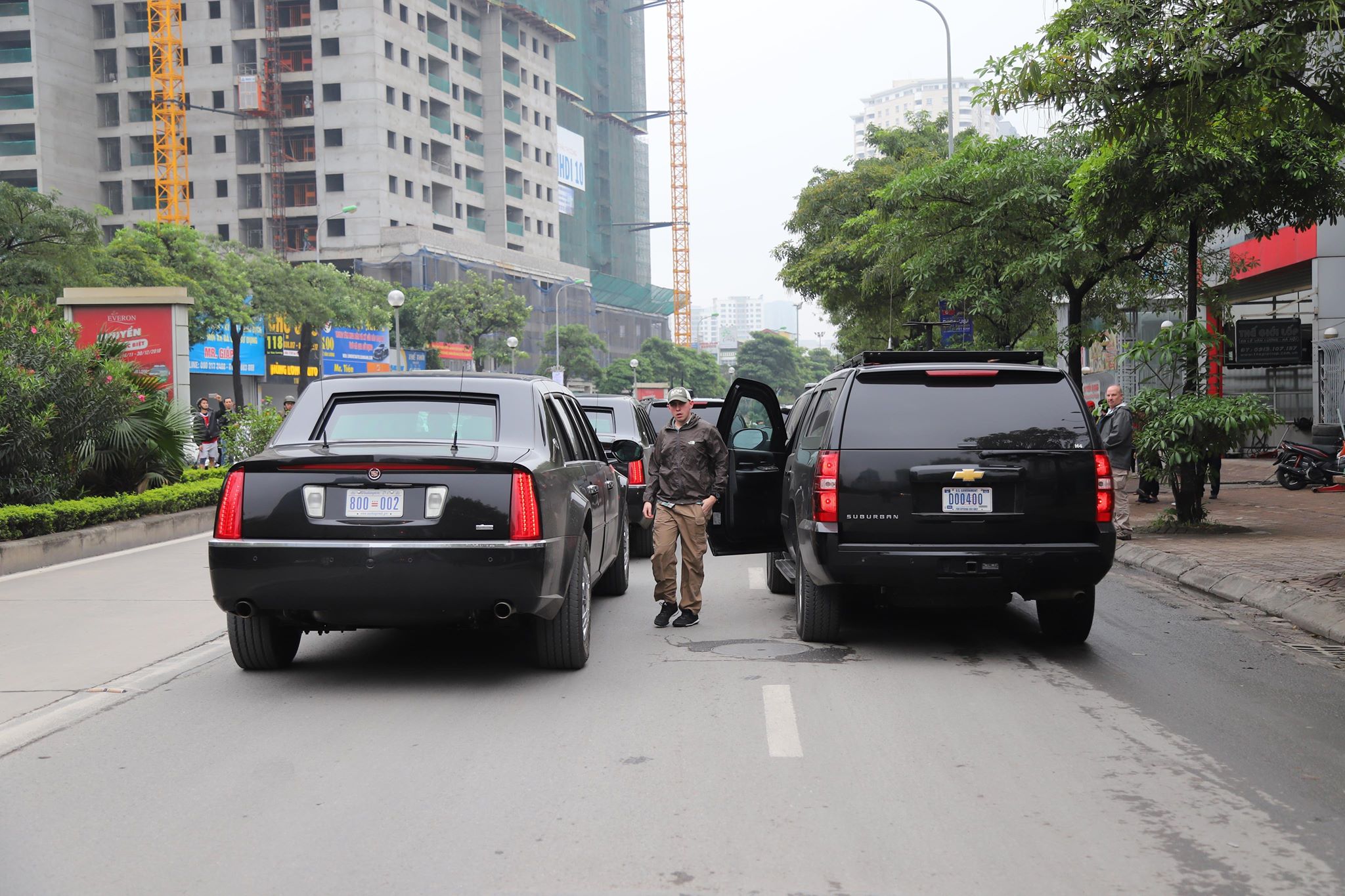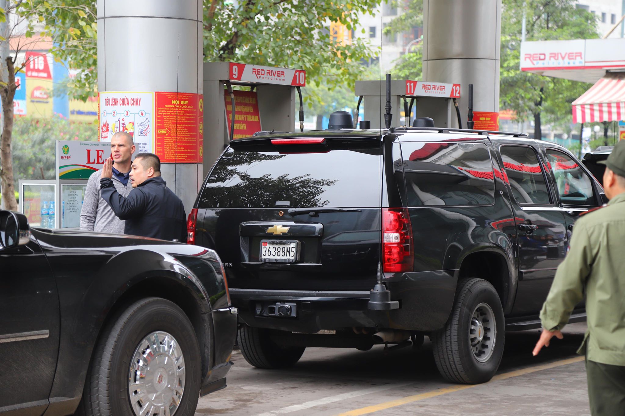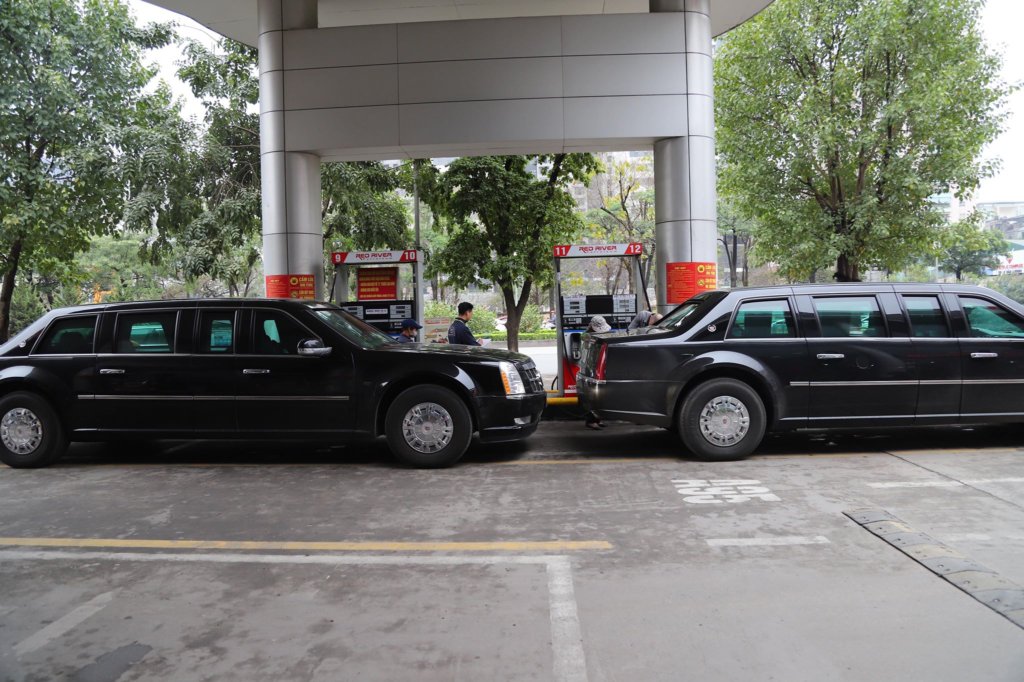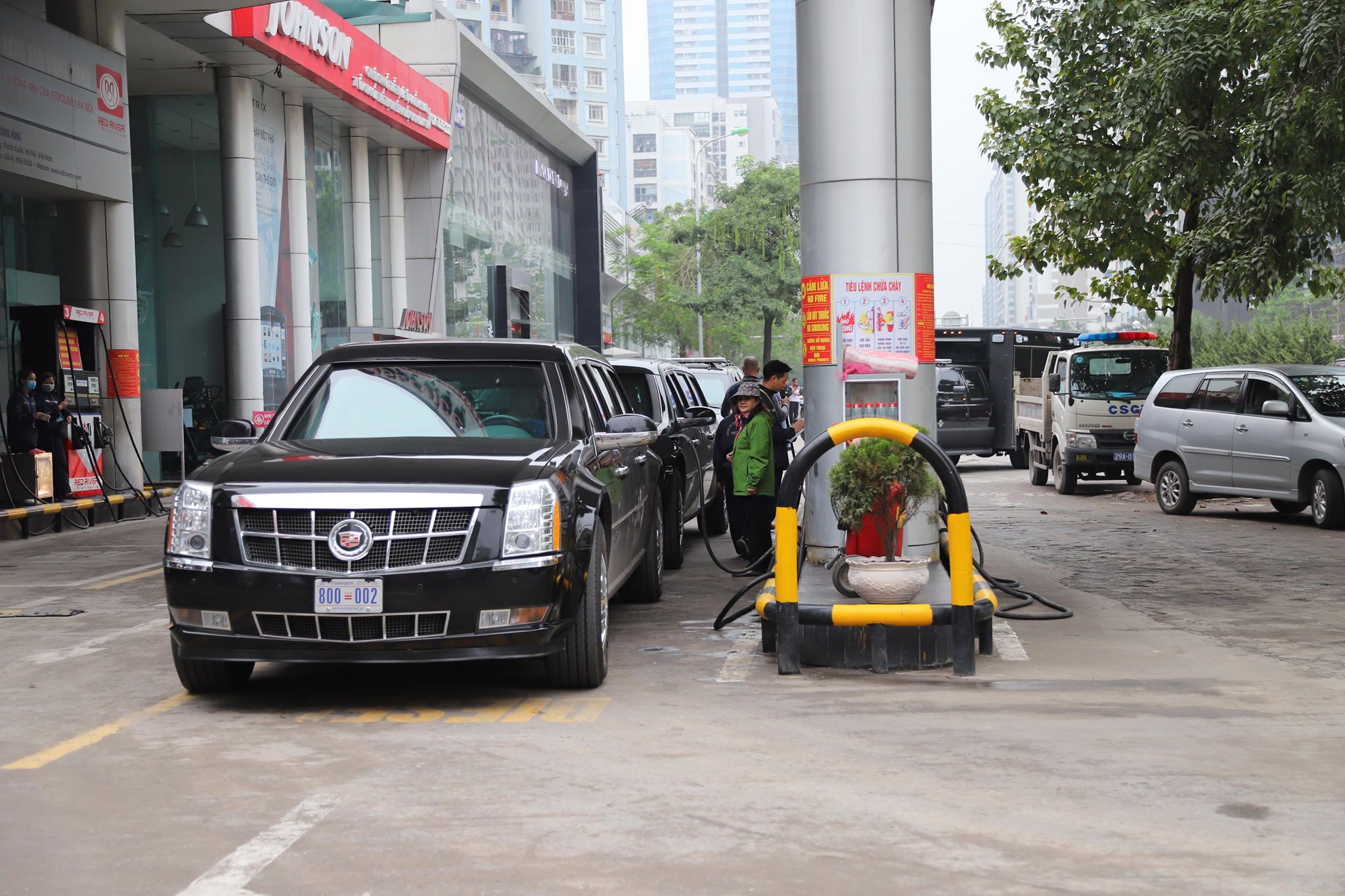 Sau khi được đổ xăng, đoàn xe di chuyển về một khách sạn hạng sang trên đường Đỗ Đức Dục, Hà Nội, nơi được cho là địa điểm Tổng thống Trump có thể lưu lại khi ông đến Việt Nam.