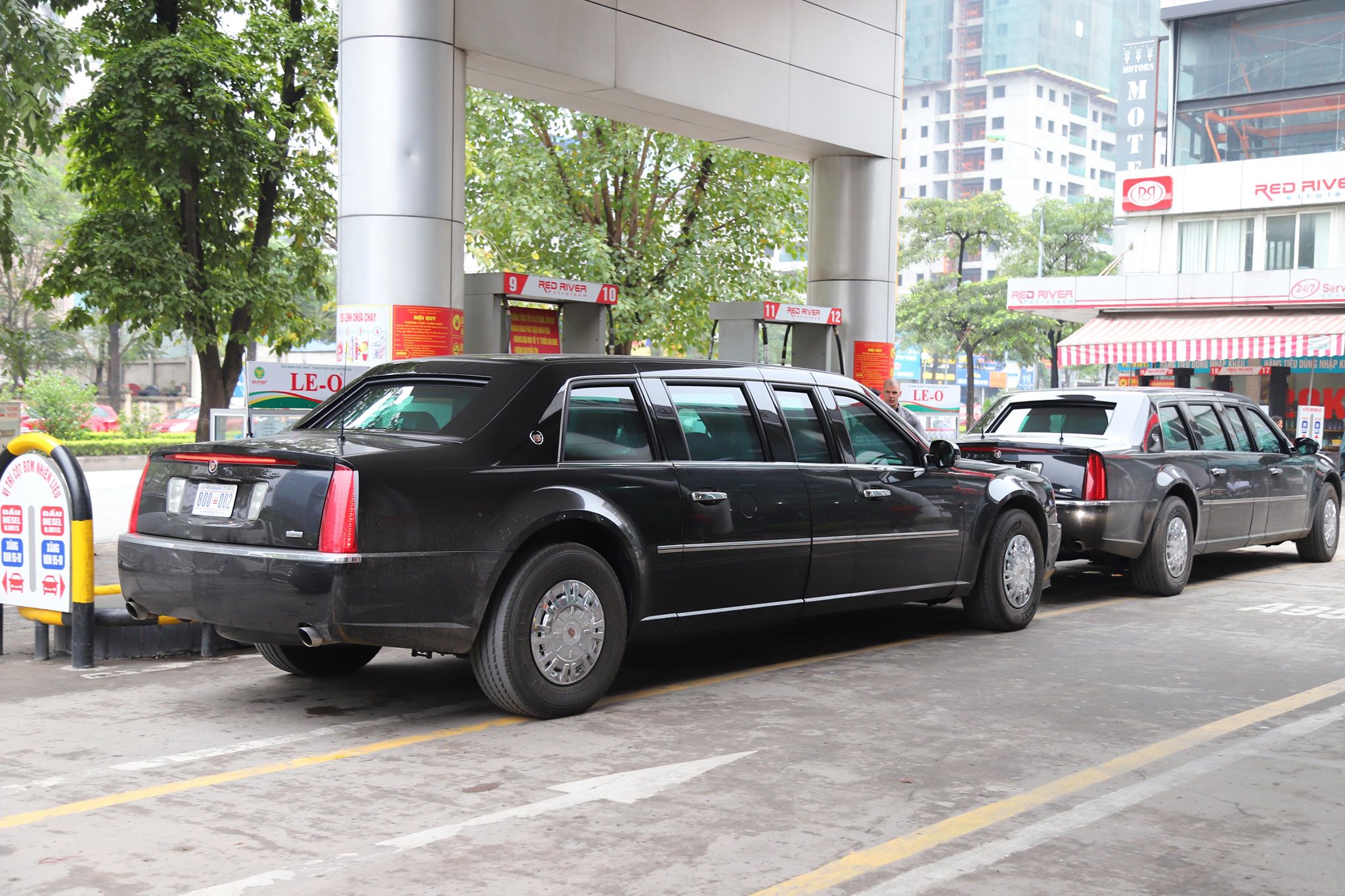 Mỗi chiếc “Quái thú” được đổ 47 lít xăng A95. Phía Mỹ có người tự cầm vòi đổ xăng cho hai chiếc xe của Tổng thống.