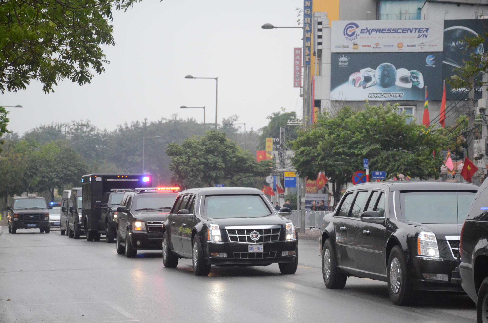 Sáng 23/2, đoàn xe của tổng thống Mỹ đã xuất hiện trên đường phố Hà Nội. Đoàn xe của tổng thống Mỹ gồm nhiều chiếc, nổi bật nhất là 2 Cadillac One, biệt danh The Beast (quái thú), siêu xe chống đạn dành riêng cho chủ nhân Nhà Trắng.