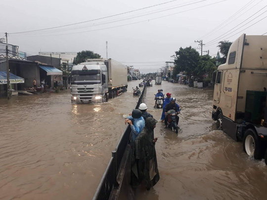 Theo Người lao động, trên Quốc lộ 1, tình trạng ngập nặng xảy ra ở khu vực TP Cam Ranh, khiến giao thông ách tắc.